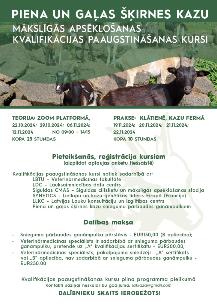 Piena un gaļas šķirnes kazu mākslīgās apsēklošanas kvalifikācijas paaugstināšanas kursiBy wds / 1. oktobris, 2024. Pasākuma programma no 22.10.2024 līdz 22.11.2024Teorijas daļa: ZOOM platformāPraktiskā daļa: Klātienē, kazu fermā Pieteikties elektroniski šeit: https://forms.gle/Jn8aZr6wuYK2Fx5H6NB! Dalībnieku skaits ierobežotsSaziņai – latkaza@gmail.com Detalizēta informācija pielikumos: 1. pielikumā – norises laiki, kvalifikācijas stundas, izmaksas PDF>>>2. pielikumā – Kvalifikācijas paaugstināšanas kursu programma PDF>>>